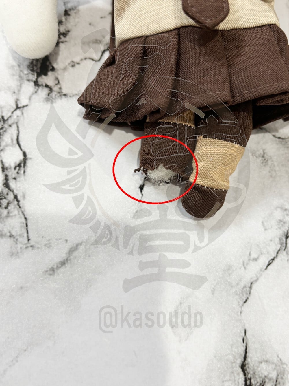 ⇒汚れの付着はありませんが足先が破れて綿が出ています