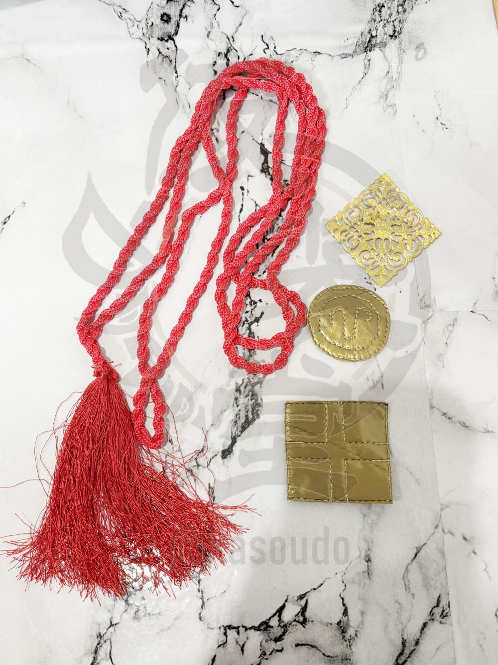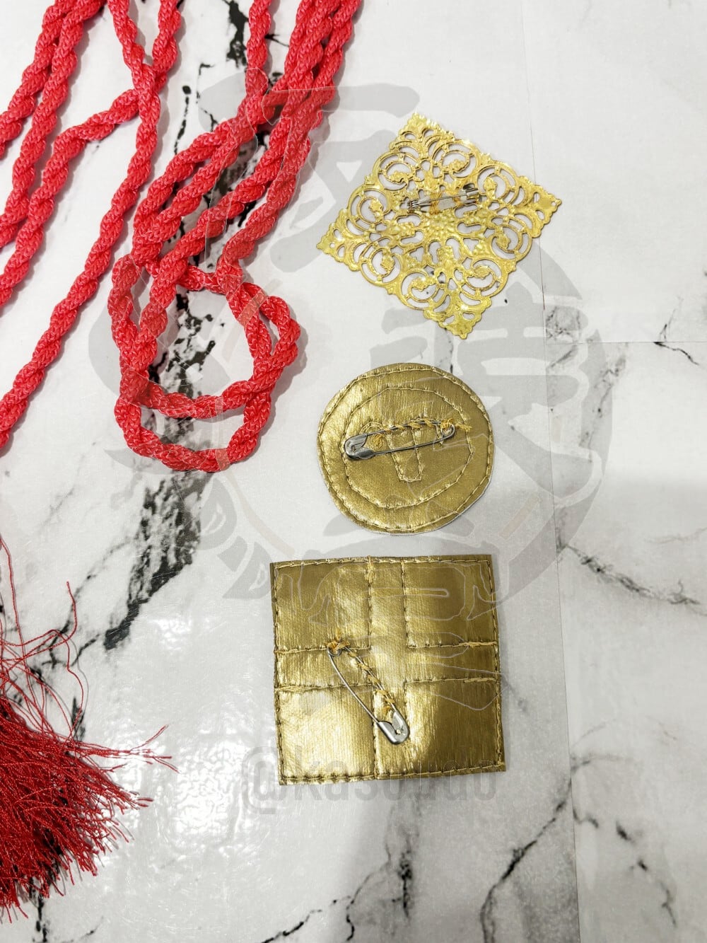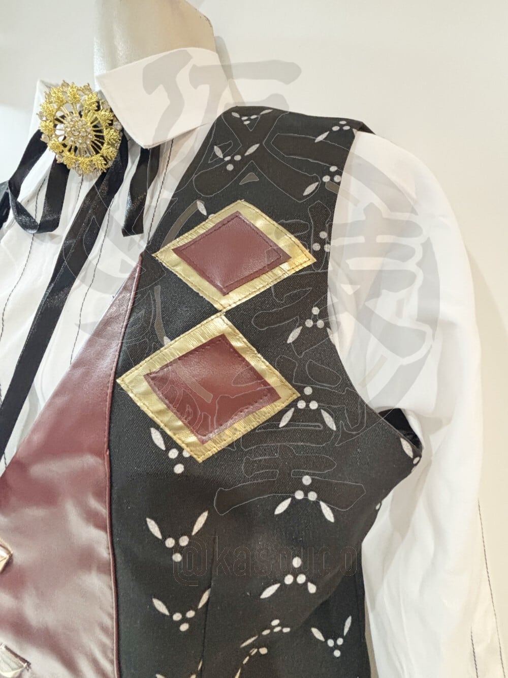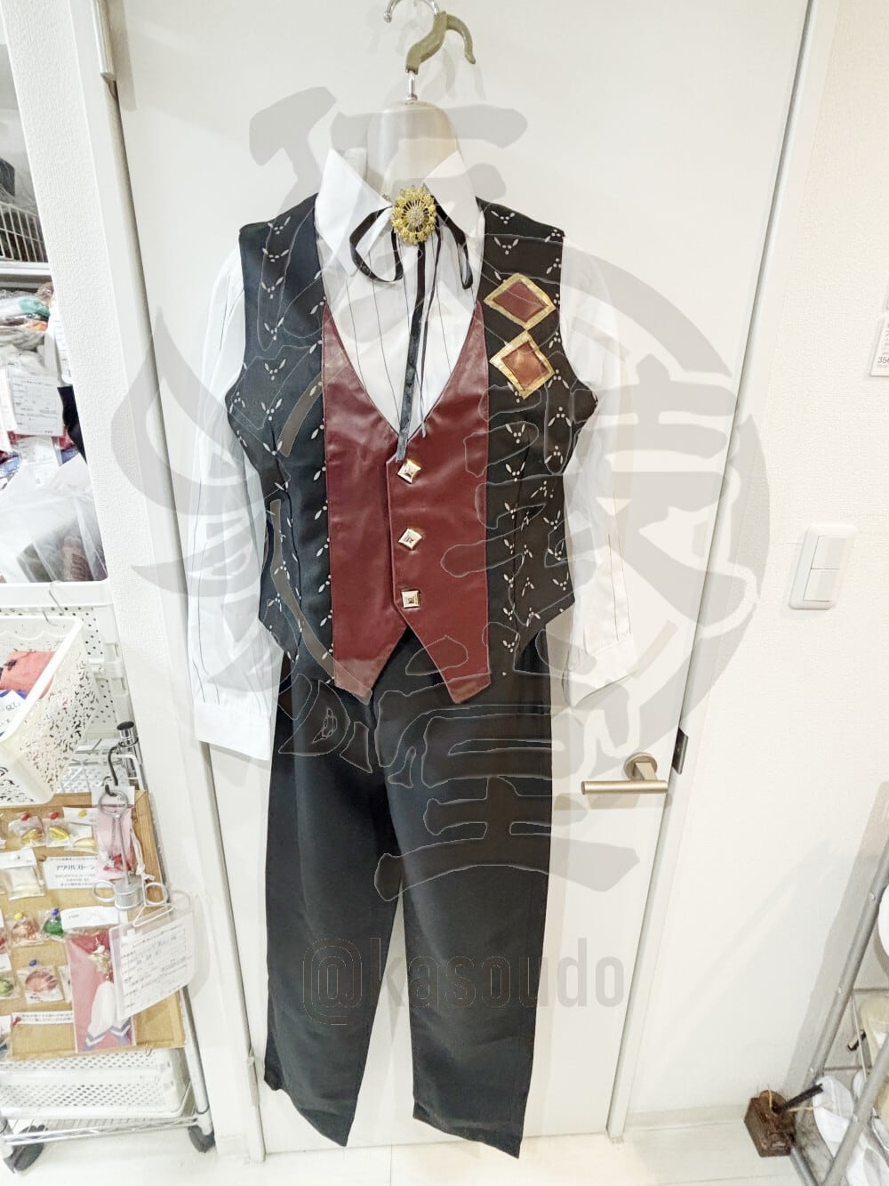 シャツ、リボン、ベスト、ズボン、太もも装飾用紐、ブローチ(合皮製・金属製)
