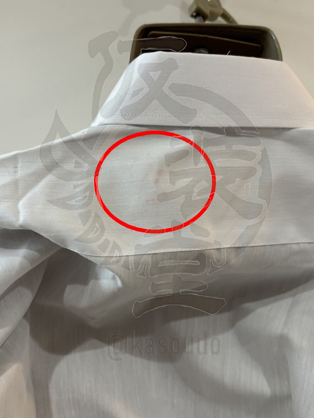 シャツの背面の一部に赤色の毛玉が縫いこまれています