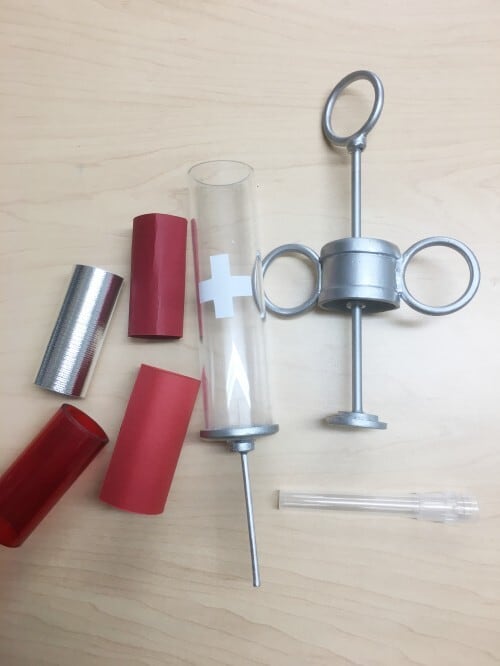 注射器本体、薬液風パーツ、色紙3種、針先保護用キャップ