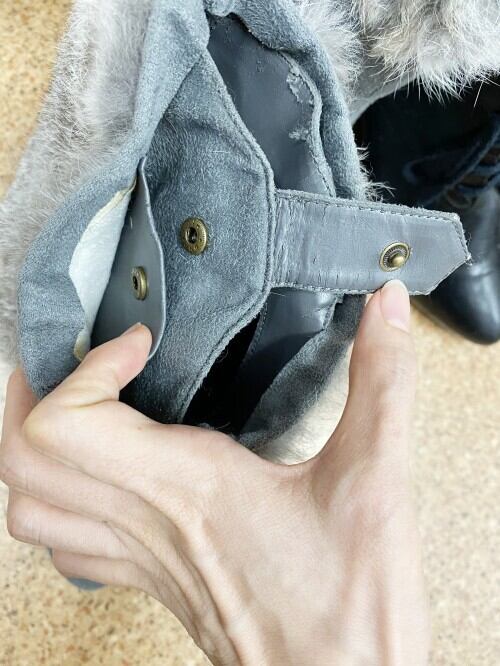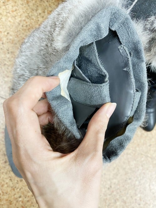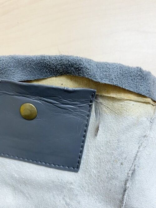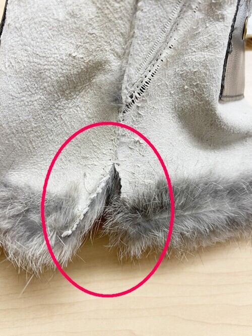 ファーの一部に布地が裂けている箇所と、表皮が剥がれかけている箇所があります。